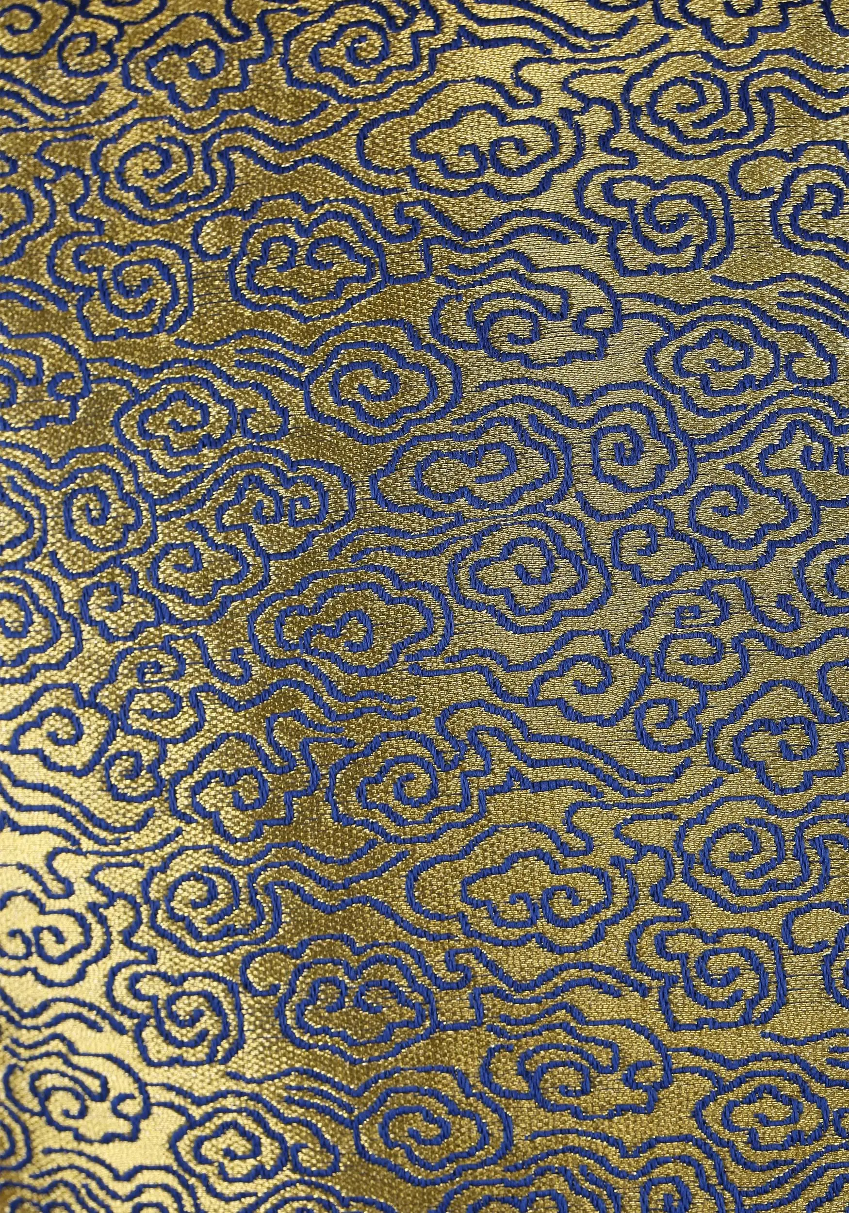 - Stretch gold satin turban has a blue faux feather w/ faux jewel