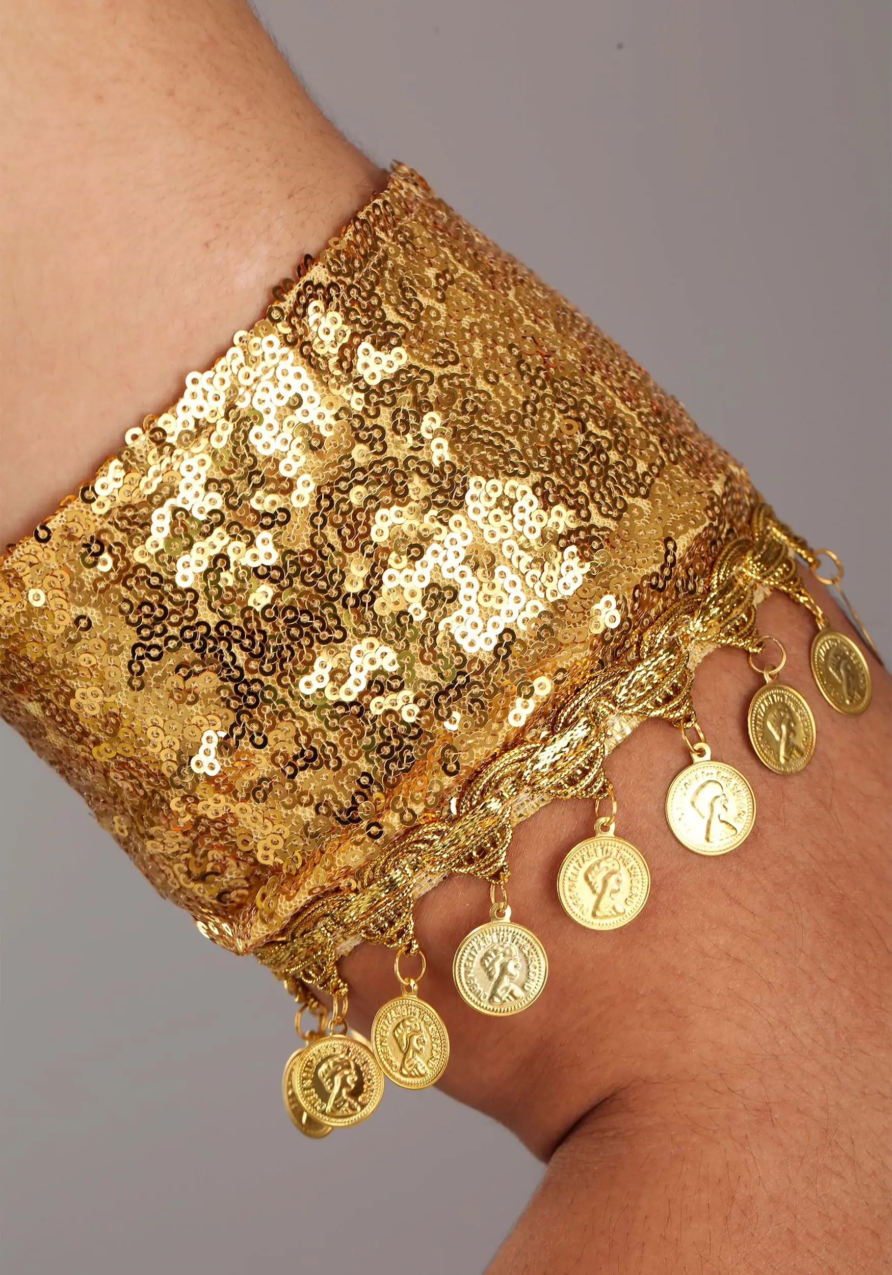 - Arm and wrist bands have all over sequins and coin trim with hook and loop fasteners