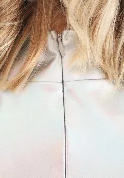 - Dress fabric has iridescent metallic finish on outer surface