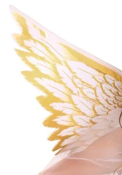 - White feather and gold tinsel halo is attached to a plastic headband