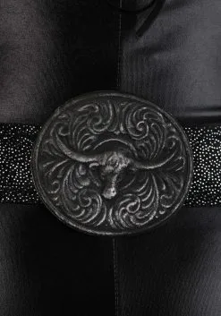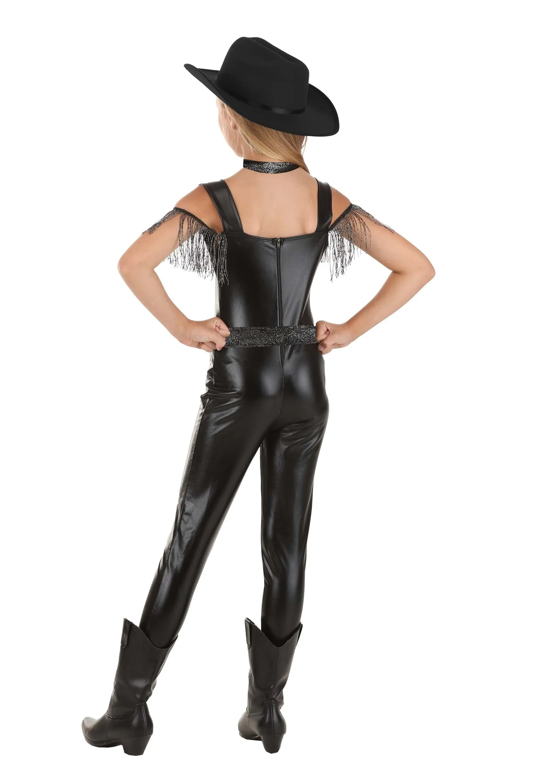 You’re fit to headline at the Grand Ole Opry in this Honky Tonk Girl’s Cutie Costume! The one-piece sleeveless jumpsuit has a back zipper and is made of shiny black faux leather. Wide black shoulder straps frame the neckline, and a row of fringe loops areound the front and the back of the chest, adding some cold shoulder style to this already rocking costume. All you’ll need to do after you put it on is grab the big, showy cowgirl hat, then add some cowgirl boots and your lucky microphone. Stardom is calling your name!