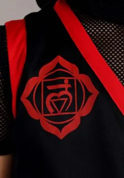 This black suit would have blended into the night and the dark shadows of the room, but we had to give you a fighting chance to keep track of those stealth missions, so the trim is bright red, along with the styling belt and mask. The leggings have attached wraps to give a bit of extra kick to the kicks! Her enemies will see a blur of black and red as they flit around ready to take on anyone that opposes them.