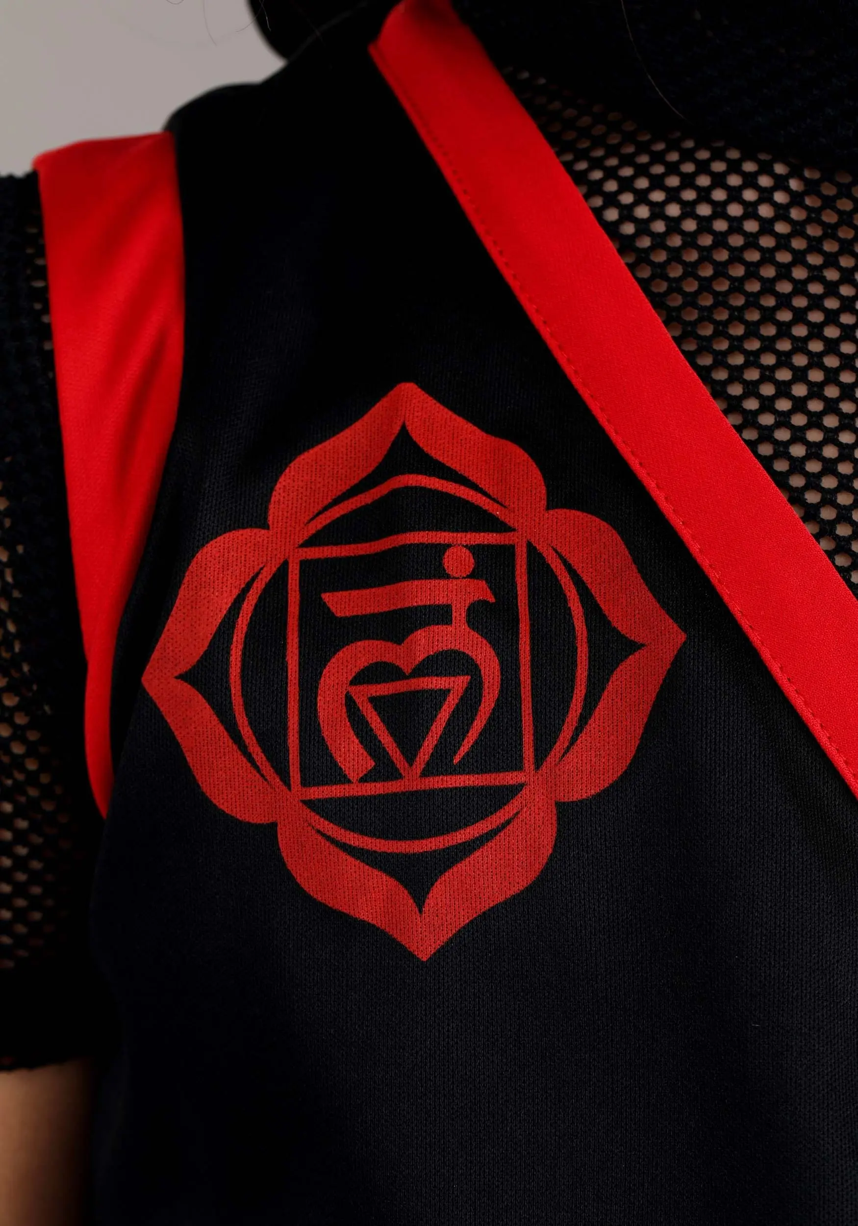 - Short-sleeved mesh shirt has hook & loop fastener at back of neck