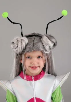 A pair of green leggings match the costume sleeves giving the wearer an alien coloring. Meanwhile, a plastic headband provides the costume with a curious and bendable set of alien antennae. Silver elbow-length gloves and a matching belt with a Saturn applique on its front polish the look. Pair with separately sold wigs, costume shoes, or sparkling kid-friendly makeups for even more fun!