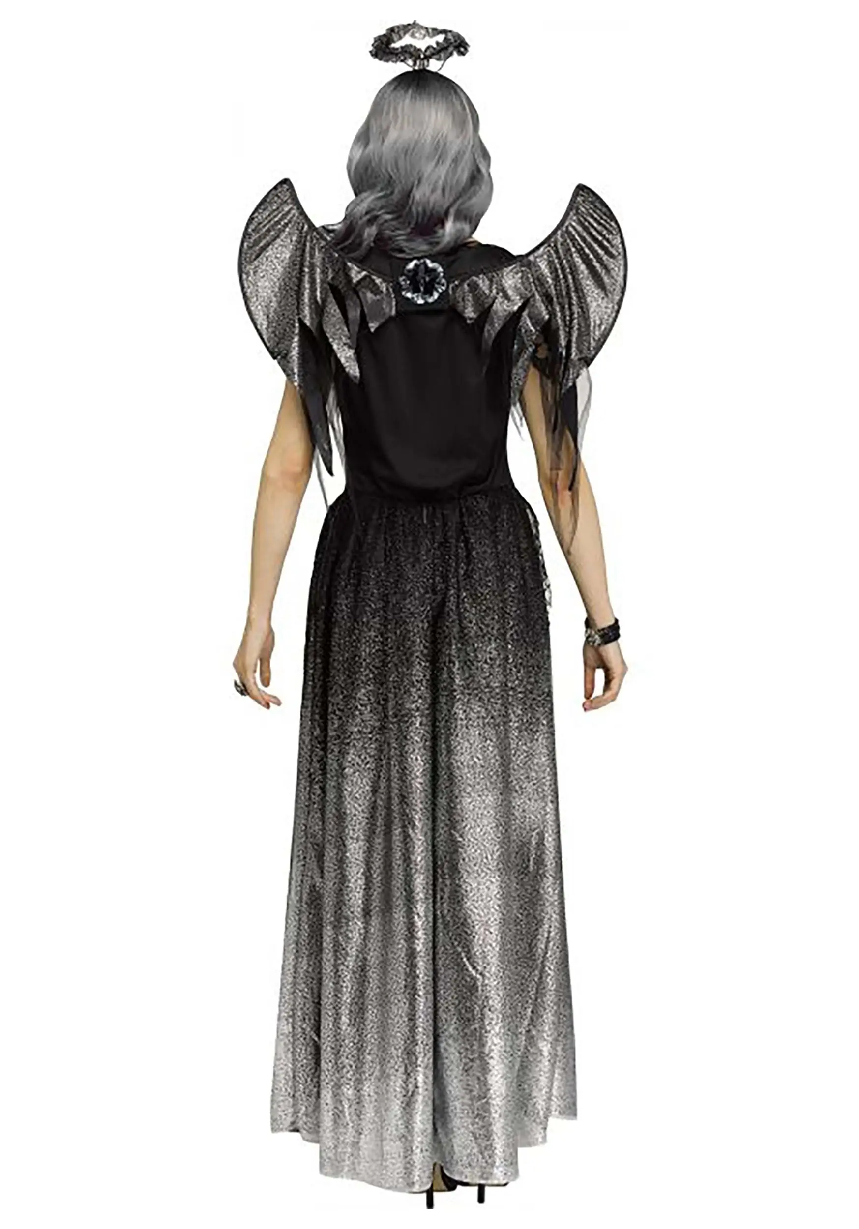 This dark Angel costume features a gray and black floor-length gown, wings, and a halo headband. The pull-over dress is detailed with black lace, a sparkling V on the bodice, and a built-in petticoat to add drama to your sillouhette. Jagged wings dripping with black guaze for a spooky touch attach to your ensemble with elastic straps. Complete with a silver halo, this costume is ready for any Halloween gathering!
