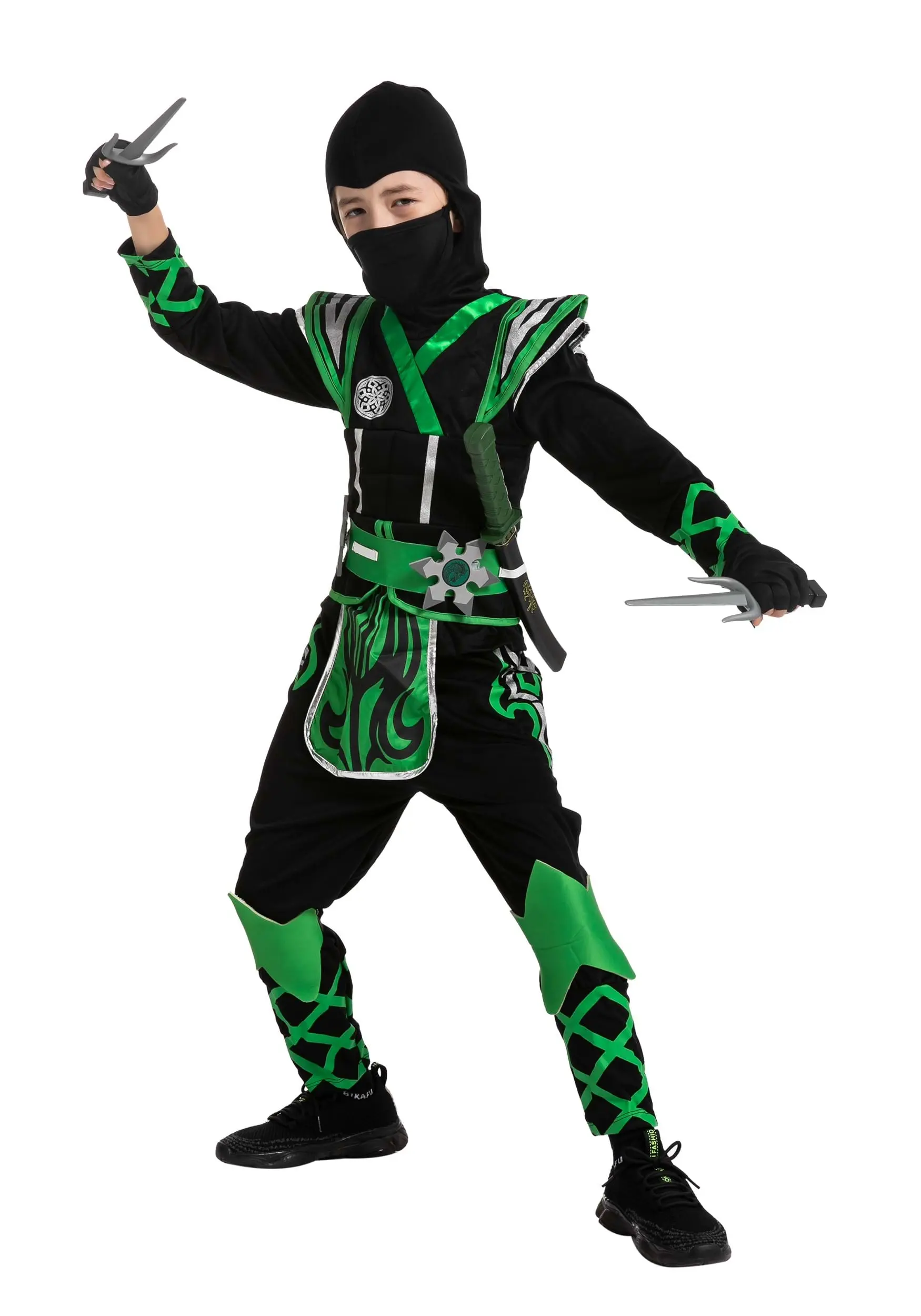 Show off your skills in an awesome Green Ninja Costume for Kids! The all-polyester outfit includes a pullover black shirt that features criss-cross creen detail on the sleeves and an attached hood that pulls up over your head. A sleeveless vest slips on over the top and zips up the back. Its printed with armor graphics and has faux armor plates over each shoulder. The matching green belt has a sash sewn to the front and features attached elastic bands that can hold your weapons. Green criss-cross detailed knee pads fasten with elastic bands, as does the black face mask. The costume comes with a toy sword and matching sword case, a pair of toy daggers, and a pair of foam throwing stars.