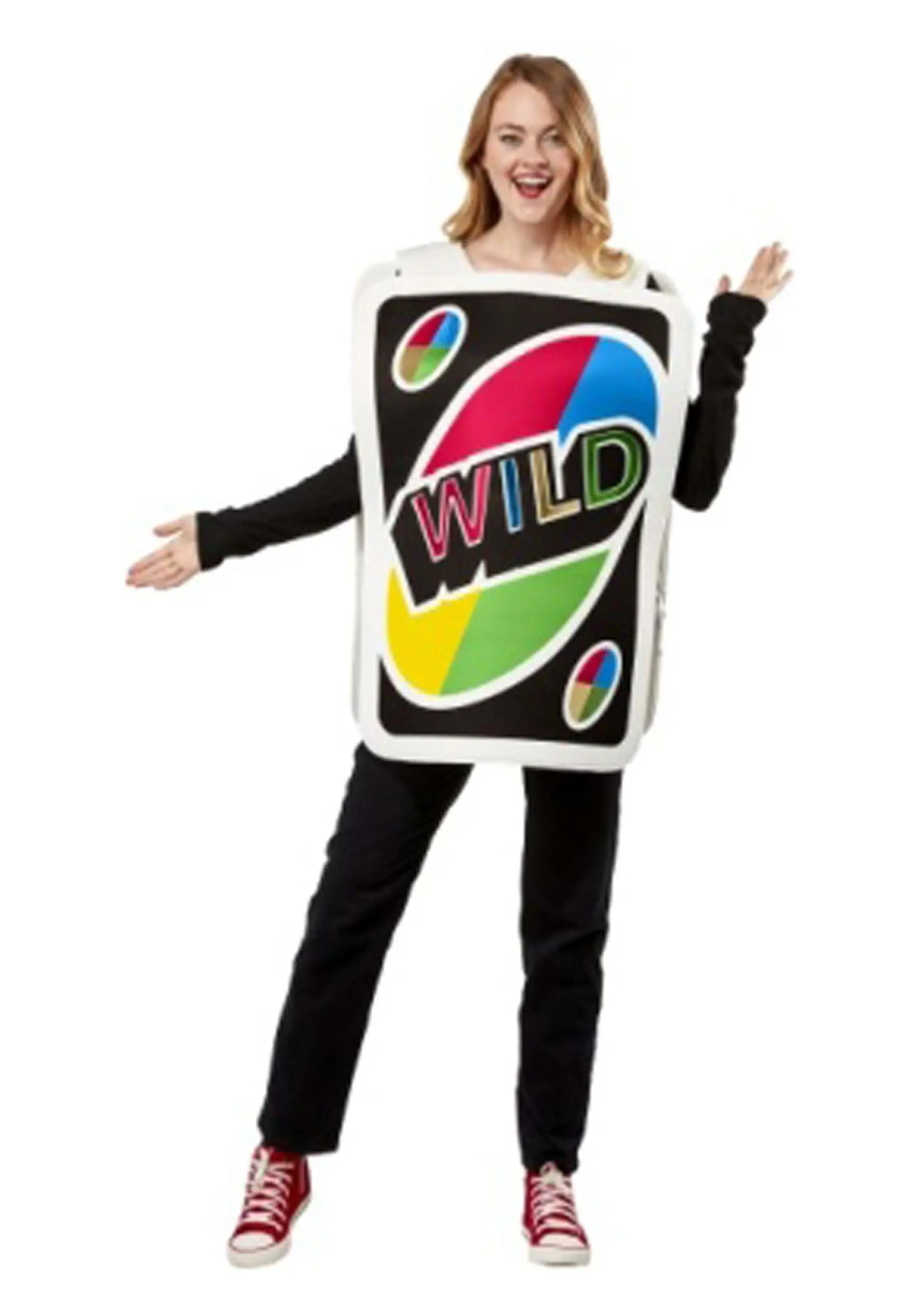 Have a literal trick up your sleeve (or at least on your shirt!) when you wear this officially licensed Uno Wild Card Costume for Adults! The outfit consists of a long, sleeveless tunic shaped like an oversized playing card with rounded edges and backed with stiffened foam. Both sides are printed with the classic graphics of the Uno card that players most want to have in their hands, complete with the red, blue, yellow and green ovals on a black background and the word “Wild” across the middle.Â