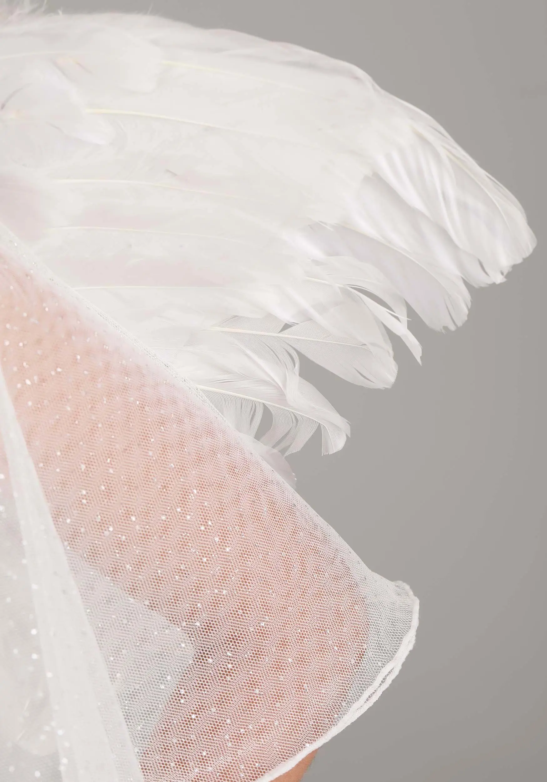 - Halo is feather-covered wire w/ silver tinsel, attached to plastic headband